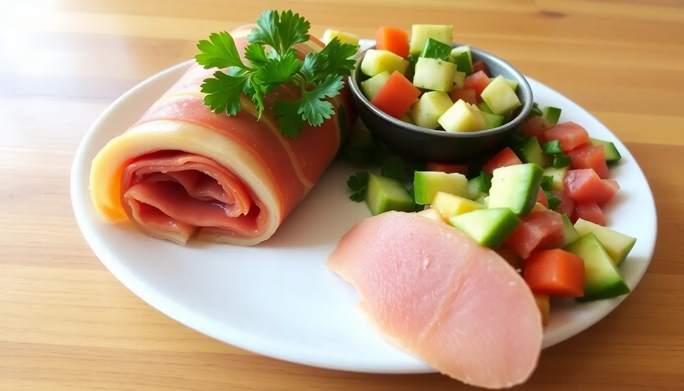 Repite este proceso con las demás lonchas de jamón. La presentación es clave, así que asegúrate de que el relleno sobresalga un poco para que sea visualmente atractivo.